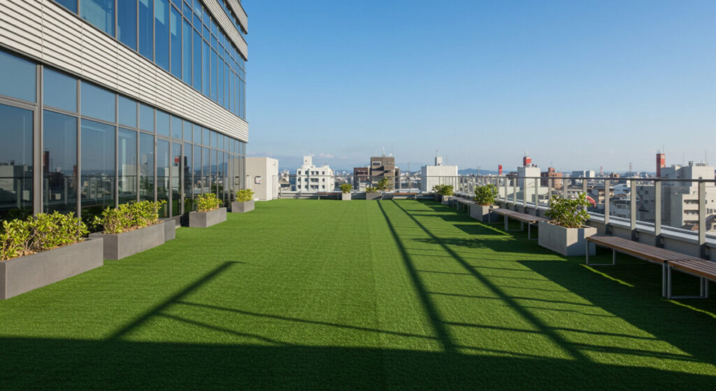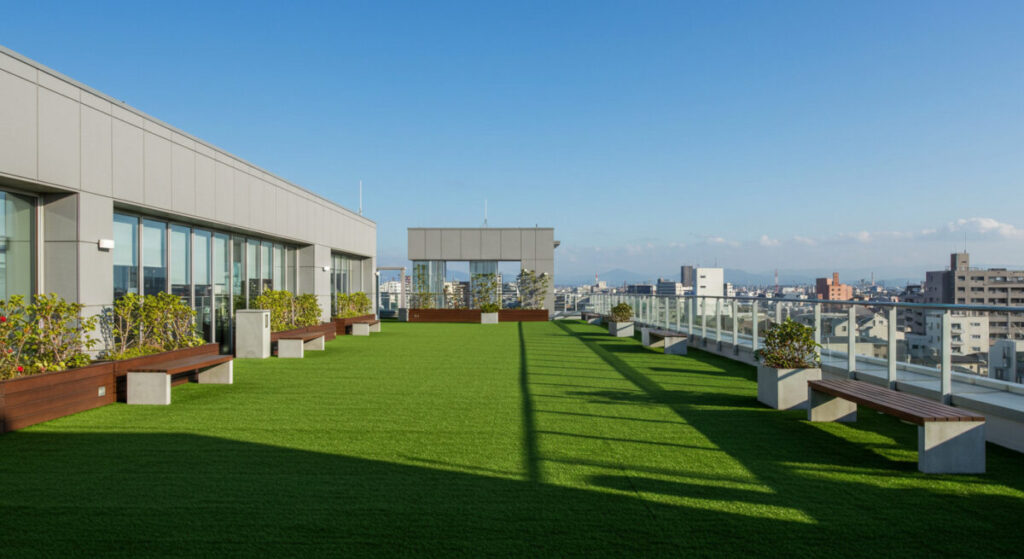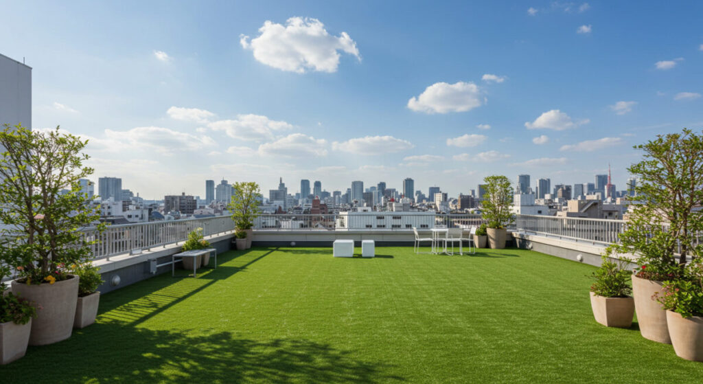 転倒時の衝撃をやわらげるクッション性や、防炎・抗菌・防カビといった機能を備えた人工芝を選ぶことで、快適かつ安心な屋上空間を実現できます。