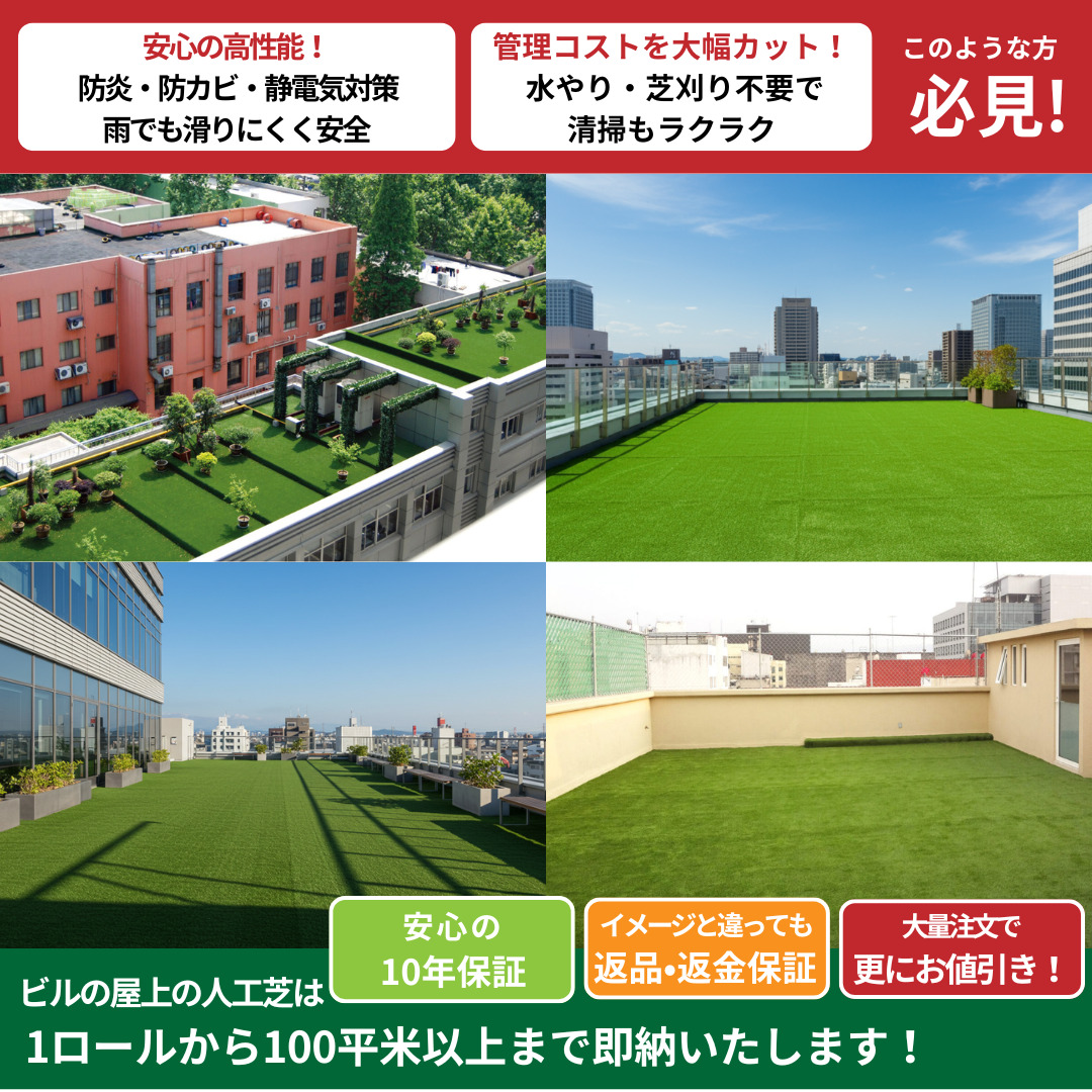 ビルの屋上に人工芝を敷く際、長持ちするかどうかはとても重要な判断基準です。人工芝の寿命は製品によって大きく異なり、短いもので2年、長いもので10年以上使えるものもあります。