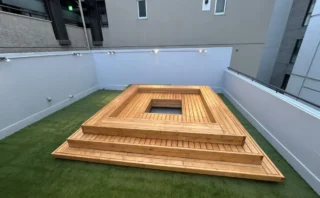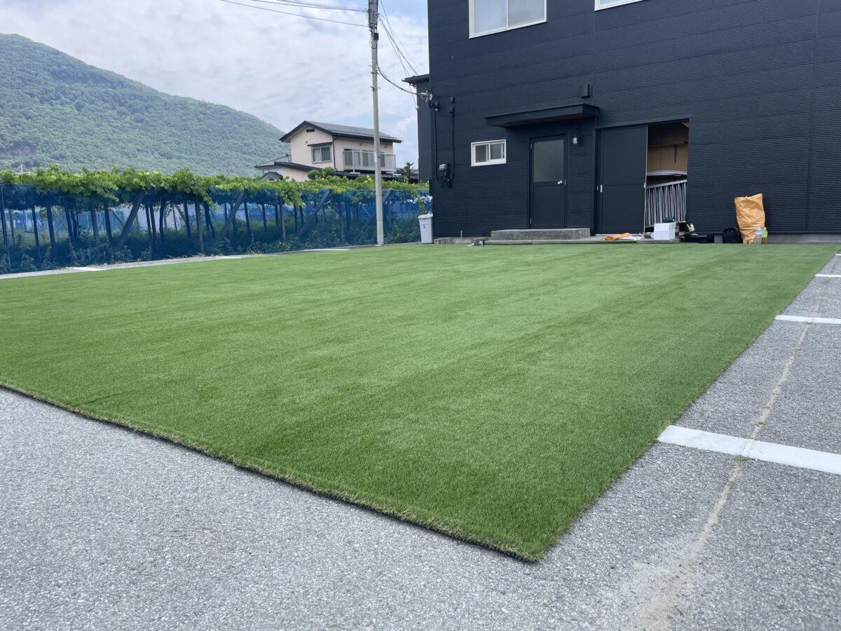 人工芝「エターナルターフ」を職人が丁寧に施工している様子。接着剤ディノグリップによるしっかりとした固定で、長期間の使用にも安心です。緑が少し加わるだけでも雰囲気が変わりますよね。