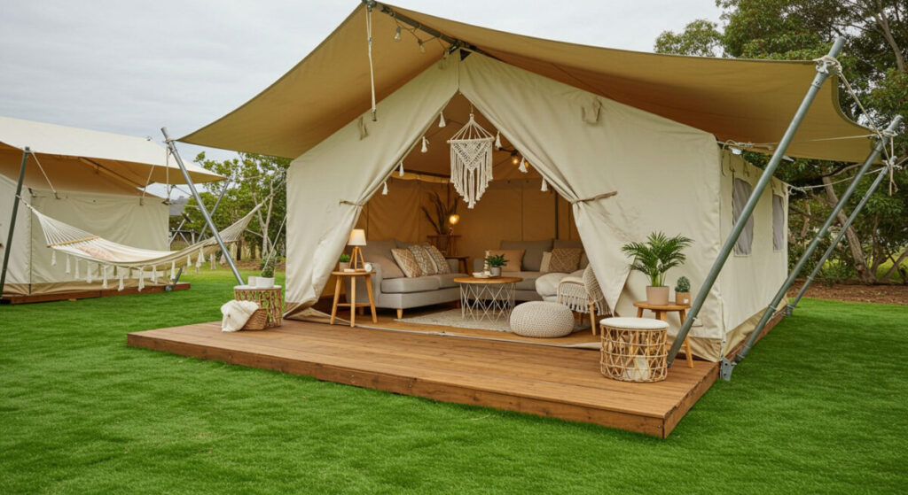 キャンプ場の印象を決定づける地面環境だからこそ、倒れにくく、耐久性に優れた人工芝を選択するのがベストですね。