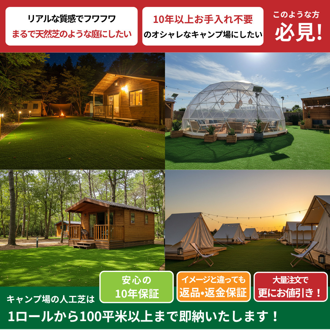 人工芝の耐用年数は2年~10年以上と幅があり、利用頻度や立地条件によっても変わります。キャンプ場は不特定多数が利用するため、より頑丈なものが望まれます。